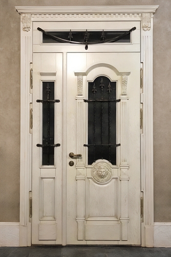 Двустворчатая дверь МДФ с карнизом, с остеклением и коваными решетками