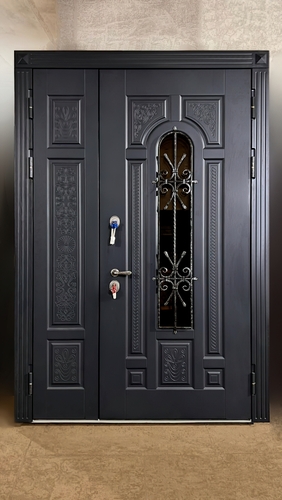 Полуторная термодверь с ажурной фрезеровкой, ковкой и стеклом